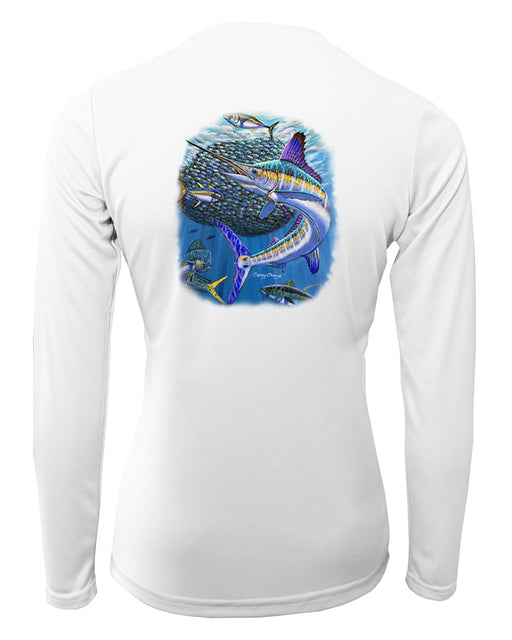 View full detailsWomen’s Long Sleeve V-Neck White Marlin Performance Shirt – “Bait Ball Frenzy” by Carey Chen