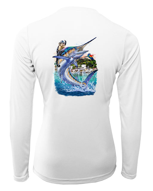 View full detailsWomen’s Long Sleeve V-Neck White Marlin Performance Shirt – “Costa Rican Marlin” by Carey Chen