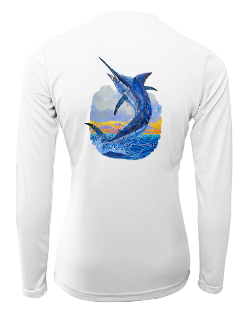 View full detailsWomen’s Long Sleeve V-Neck White Marlin Performance Shirt – “Sunset Hookup” by Carey Chen