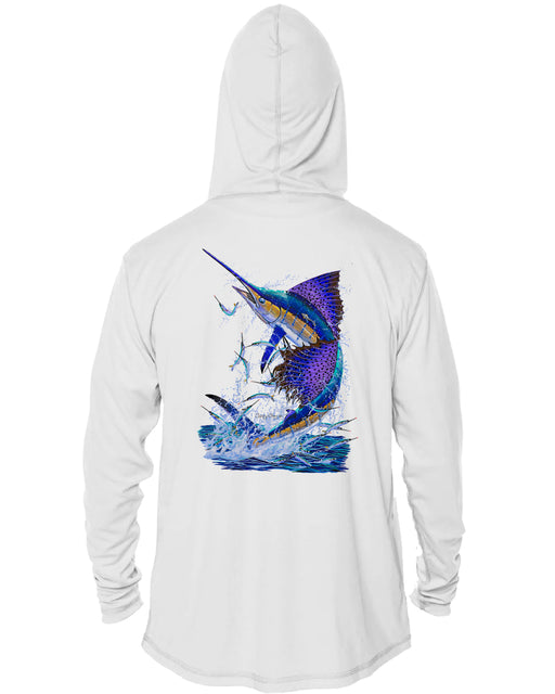 Men’s Hooded Sailfish Performance Shirt – “Sailfish Splash” by Carey Chen