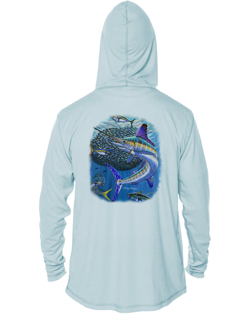 Men’s Hooded White Marlin Performance Shirt – “Bait Ball Frenzy” by Carey Chen